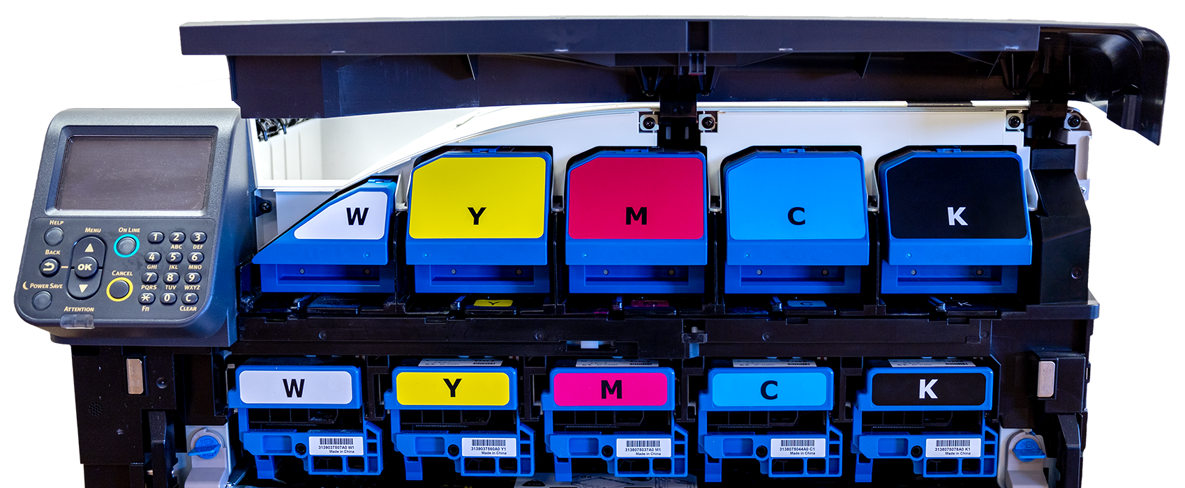 - πΉ 5-station color engine: CMYK plus White or Clear spot color kit